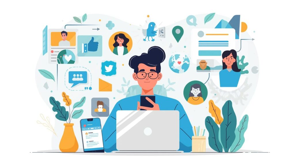 Illustration of people connecting and sharing online, symbolizing community growth by a social media specialist in Kolkata.